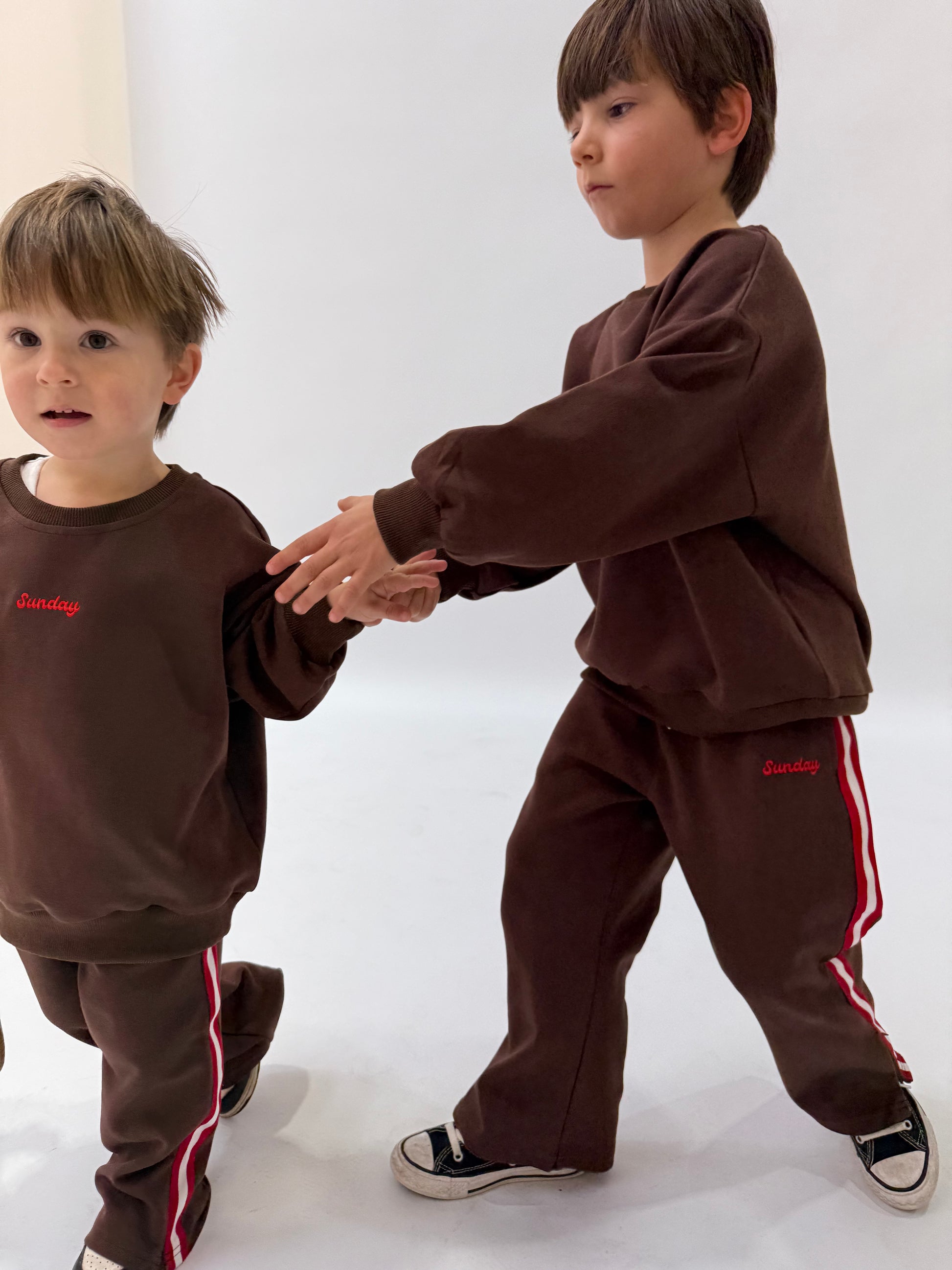 A relaxed fit which includes an oversized sweater with detailing on the back and wide leg pants also with detailing on the sides. A zip at the hem creates a more versatile pant plus a drawstring and elastic waist for all day comfort. Perfect for play, lounge or on the go!